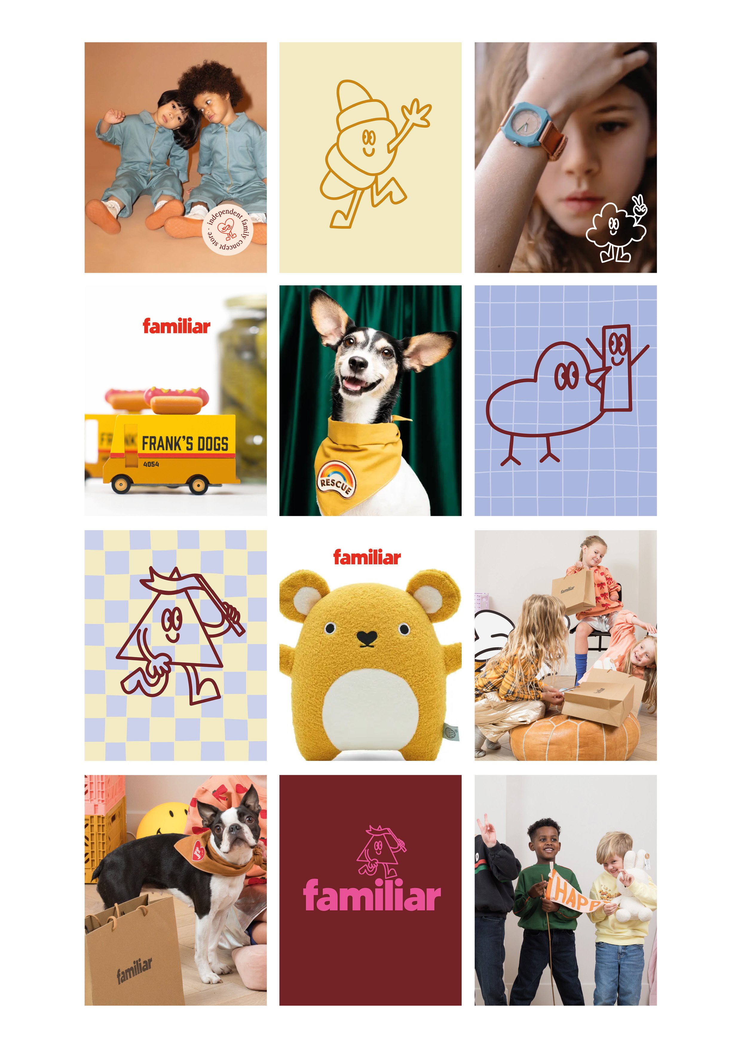 Our solution was to build a brand world that feels playful, personal and instantly recognisable. We created a distinctive logo and stand-out colour palette designed to cut through while still feeling warm and welcoming. To bring individuality and charm to the identity, we illustrated a parade of characters that appear across every touchpoint - adding movement, storytelling and personality to the brand. One of these, Mr Chips, was inspired by a drawing from the founder’s daughter, grounding the brand in real family life and reinforcing its heartfelt, community-led spirit. The result is a flexible, expressive identity that feels joyful and familiar all at once - proof that in a world as unpredictable as a toddler on a sugar rush, we all need something Familiar.